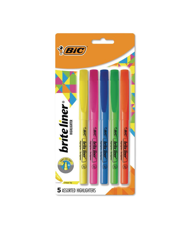 Whether you're organizing your notes or underlining passages in a textbook, BIC Brite Liner Highlighters make highlighting fun and easy. These highlighters come in a highly visible, fluorescent color, allowing you to easily color-code and emphasize information. Each highlighter has a versatile, firm chisel tip that allows you to seamlessly switch between broad highlighting and precise underlining. BIC Brite Liner Highlighters can be left uncapped for up to eight hours without drying out. And thanks to their convenient pen-shaped design, these flourescent highlighters are easy to grip and use.
