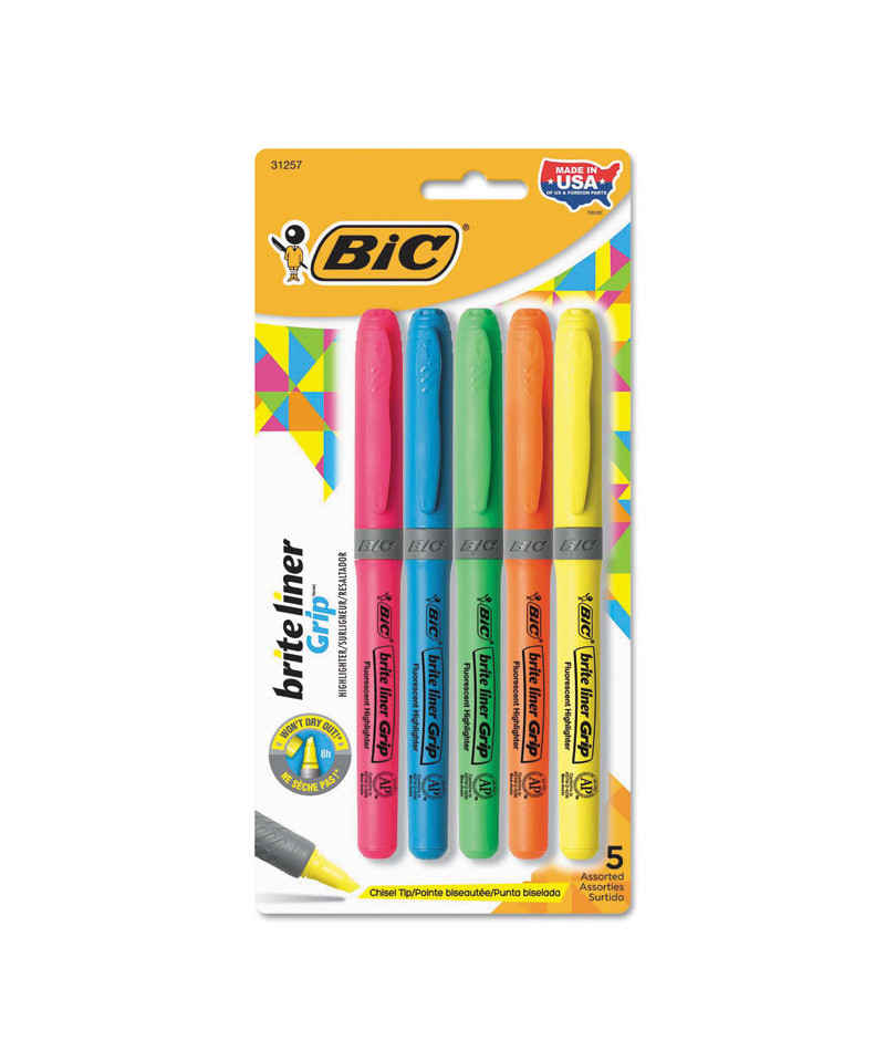 Whether you're organizing your notes or underlining passages in a textbook, BIC Brite Liner Grip Highlighters make highlighting fun and easy. These ACMI-approved highlighters feature a textured rubber grip for comfort and super-bright fluorescent ink for emphasizing information. Each highlighter has a versatile firm chisel tip that allows you to seamlessly transition from broad highlighting to precise underlining. BIC Brite Liner Grip Highlighters are non-toxic and can be left uncapped for up to eight hours without drying out. Pocket clips make them easy to bring everywhere.