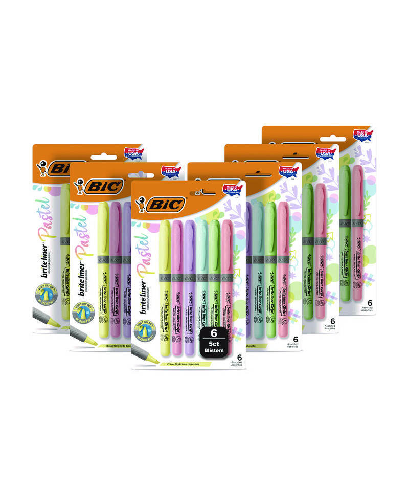Whether you're organizing your notes or underlining passages in a textbook, BIC Brite Liner Grip Highlighters make highlighting fun and easy. These ACMI-approved highlighters feature a textured rubber grip for comfort and super-bright fluorescent ink for emphasizing information. Each highlighter has a versatile firm chisel tip that allows you to seamlessly transition from broad highlighting to precise underlining. BIC Brite Liner Grip Highlighters are non-toxic and can be left uncapped for up to eight hours without drying out. Pocket clips make them easy to bring everywhere.