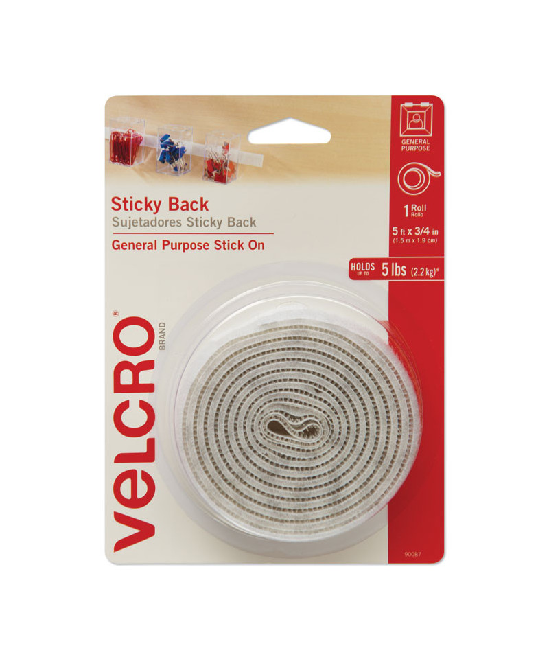 Sticky-Back Fasteners with Dispenser, Removable Adhesive, 0.75" x 5 ft, White