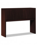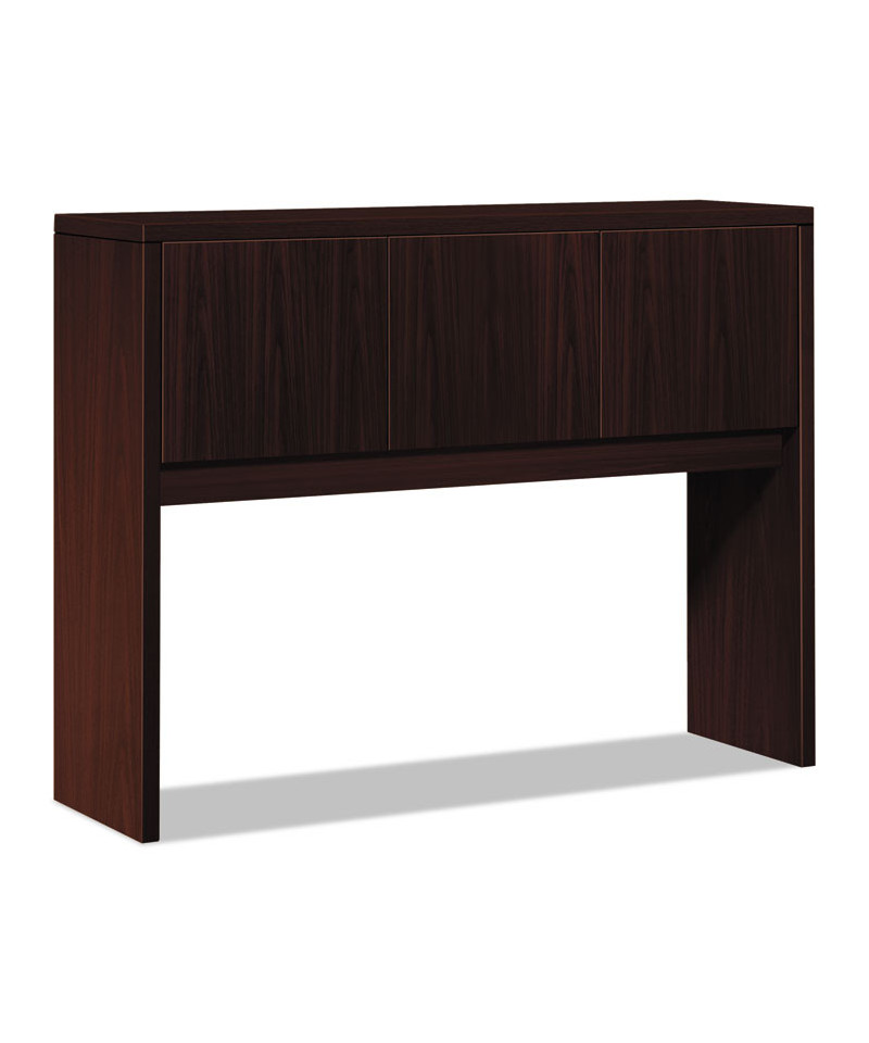 Keep your clutter behind closed doors! Durable woodgrain laminate is scratch-, stain- and spill-resistant for years of trouble-free performance. Clean, straight edges deliver a streamlined look. Enclosed storage behind self-closing, adjustable hinged doors. Valance and wire access facilitate optional task lighting.