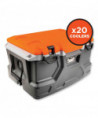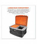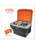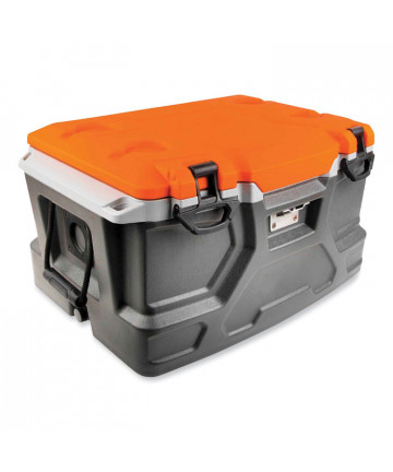 The Chill-Its 5171 Industrial Hard-Sided Cooler is a durable jobsite cooler that keeps food and drinks cold for up to 30 hours. This industrial cooler features a 48-quart (45 L) main compartment, a separate, removable interior plastic container for dry items, an exterior bottle opener and two durable carrying handles. This cooler can hold 72 cans or 40 bottles. The lid is designed with two heavy-duty rubber latches and a sealing gasket to keep the interior cool for up to 30 hours. Two no-rust stainless-steel hinges and a stainless-steel wire allow the lid to stay open at a 90° angle—hands-free. The hard-sided, rugged construction can also be used as an extra seat and will support up to 300 lbs. An interior leak-resistant drain lets you empty excess water without having to tip the cooler upside down. Four anchoring holes are located in each corner of the cooler to easily tie it down in a moving vehicle or on a jobsite.