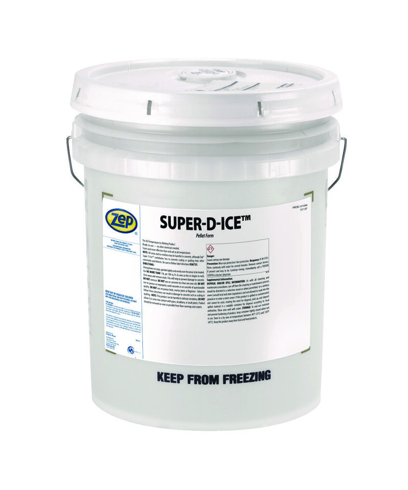 Zep Super D-ice is an all-temperature ice melting product, requiring no additional chemicals for use. It outperforms rock salt in speed and effectiveness across all temperatures. Unlike other deicers, it contributes less to concrete scaling or spalling. Apply lightly and evenly using gloves or a scoop, with a maximum usage rate of 1 lb per 100 sq ft. Once ice begins to melt, promptly clear away and remove slush to prevent concrete damage. However, exercise caution as this product may harm delicate shrubbery.