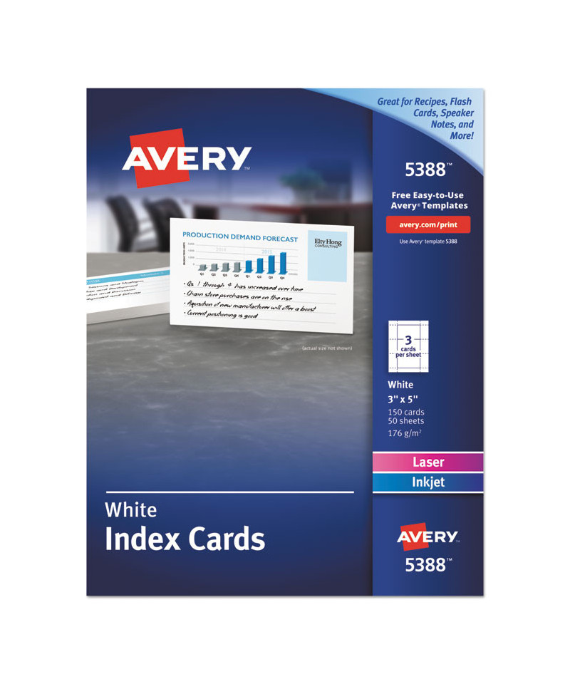 Bright white cardstock is ideal for recipes, homework, filing, and more. Custom printed index cards are consistent, easy to read, and easy to update. Ultra-fine perforations let you separate cards cleanly and easily. Easy to customize with free designs and templates from Avery Design & Print. Cards with Sure Feed® technology are designed for a reliable printer feed and to prevent jams and mis-alignments. 8.5" x 11" sheets for laser and inkjet printers.