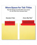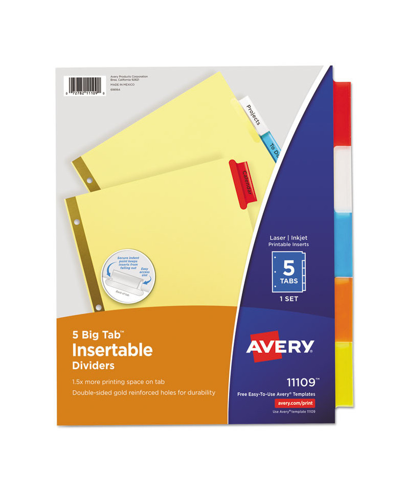 Big Tab dividers are bigger providing 50% more writing space than standard tabs. Special tab design allows easy insertion and removal, but keeps insert securely in place. Reinforced binding edge. White or buff paper dividers with clear or multicolor insertable tabs. It's easy to customize inserts using free templates from Avery Design & Print. Three-hole punched for use in standard ring binders, mini size 5.5 x 8.5 dividers are seven-hole punched for small binders and organizers, and legal size are 4-hole punched for legal size binders. Handwrite or print inserts on laser and inkjet printers.