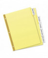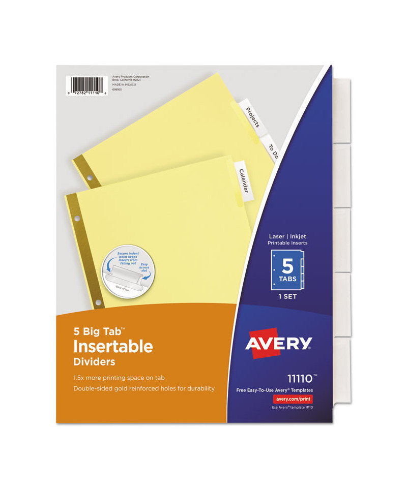Big Tab dividers are bigger providing 50% more writing space than standard tabs. Special tab design allows easy insertion and removal, but keeps insert securely in place. Reinforced binding edge. White or buff paper dividers with clear or multicolor insertable tabs. It's easy to customize inserts using free templates from Avery Design & Print. Three-hole punched for use in standard ring binders, mini size 5.5 x 8.5 dividers are seven-hole punched for small binders and organizers, and legal size are 4-hole punched for legal size binders. Handwrite or print inserts on laser and inkjet printers.