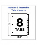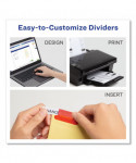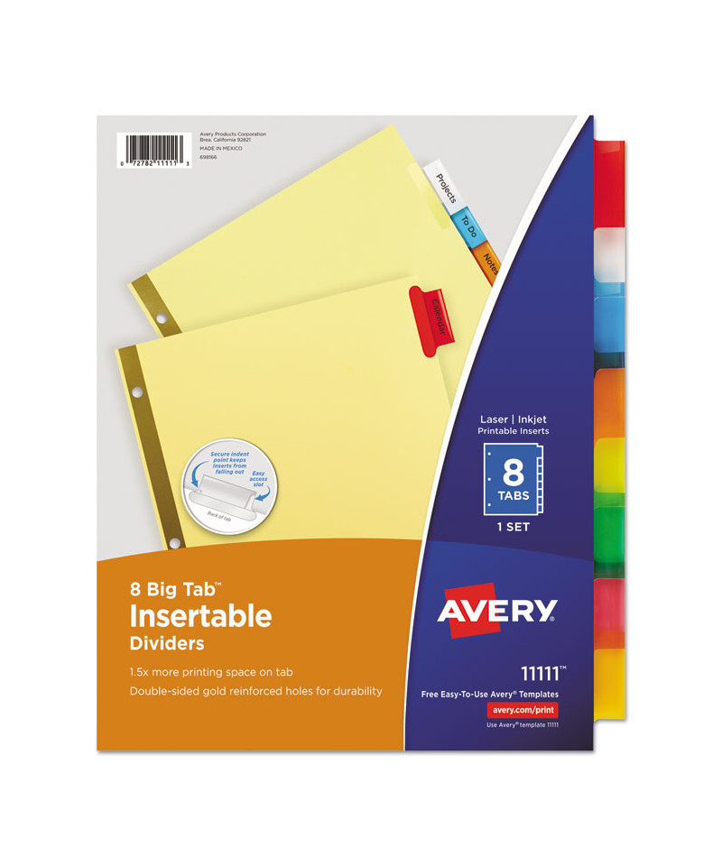 Big Tab dividers are bigger providing 50% more writing space than standard tabs. Special tab design allows easy insertion and removal, but keeps insert securely in place. Reinforced binding edge. White or buff paper dividers with clear or multicolor insertable tabs. It's easy to customize inserts using free templates from Avery Design & Print. Three-hole punched for use in standard ring binders, mini size 5.5 x 8.5 dividers are seven-hole punched for small binders and organizers, and legal size are 4-hole punched for legal size binders. Handwrite or print inserts on laser and inkjet printers.