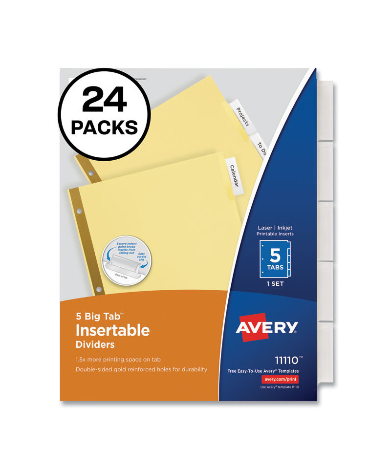 Big Tab dividers are bigger providing 50% more writing space than standard tabs. Special tab design allows easy insertion and removal, but keeps insert securely in place. Reinforced binding edge. White or buff paper dividers with clear or multicolor insertable tabs. It's easy to customize inserts using free templates from Avery Design & Print. Three-hole punched for use in standard ring binders, mini size 5.5 x 8.5 dividers are seven-hole punched for small binders and organizers, and legal size are 4-hole punched for legal size binders. Handwrite or print inserts on laser and inkjet printers.