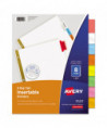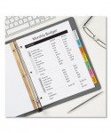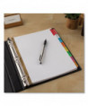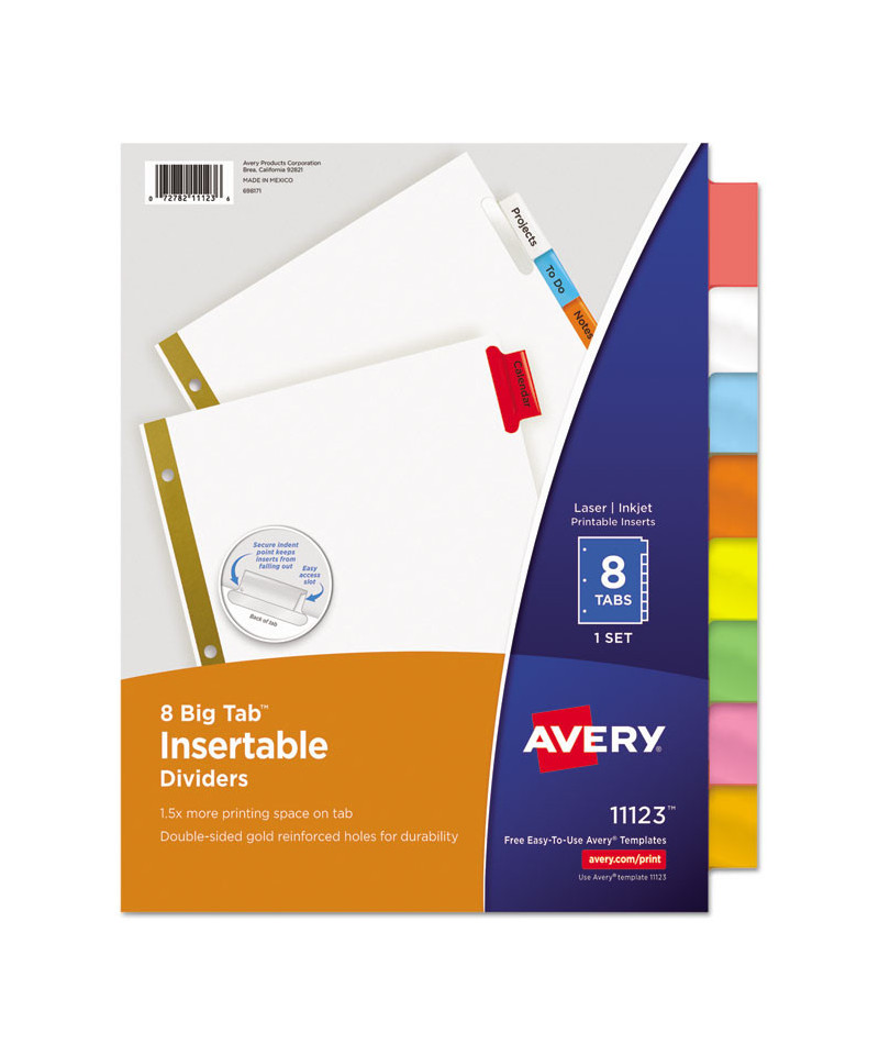 Big Tab dividers are bigger providing 50% more writing space than standard tabs. Special tab design allows easy insertion and removal, but keeps insert securely in place. Reinforced binding edge. White or buff paper dividers with clear or multicolor insertable tabs. It's easy to customize inserts using free templates from Avery Design & Print. Three-hole punched for use in standard ring binders, mini size 5.5 x 8.5 dividers are seven-hole punched for small binders and organizers, and legal size are 4-hole punched for legal size binders. Handwrite or print inserts on laser and inkjet printers.