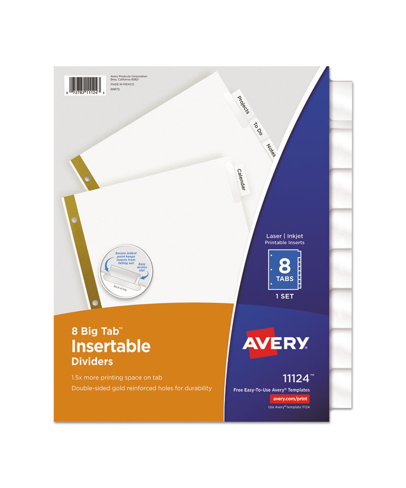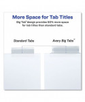 Big Tab dividers are bigger providing 50% more writing space than standard tabs. Special tab design allows easy insertion and removal, but keeps insert securely in place. Reinforced binding edge. White or buff paper dividers with clear or multicolor insertable tabs. It's easy to customize inserts using free templates from Avery Design & Print. Three-hole punched for use in standard ring binders, mini size 5.5 x 8.5 dividers are seven-hole punched for small binders and organizers, and legal size are 4-hole punched for legal size binders. Handwrite or print inserts on laser and inkjet printers.