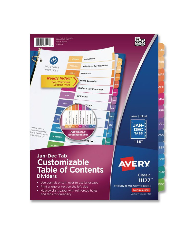 Organized documentation makes a business run like a well-oiled machine. These Ready Index Table of Contents Dividers help you stay organized so you can locate documents quickly and efficiently. They feature preprinted multicolor tabs that can be displayed in either landscape or portrait format. Using free templates from Avery Design & Print you can customize the included table of contents page and print in minutes. Organization and efficiency-makes life better for your business. For laser and inkjet printers.