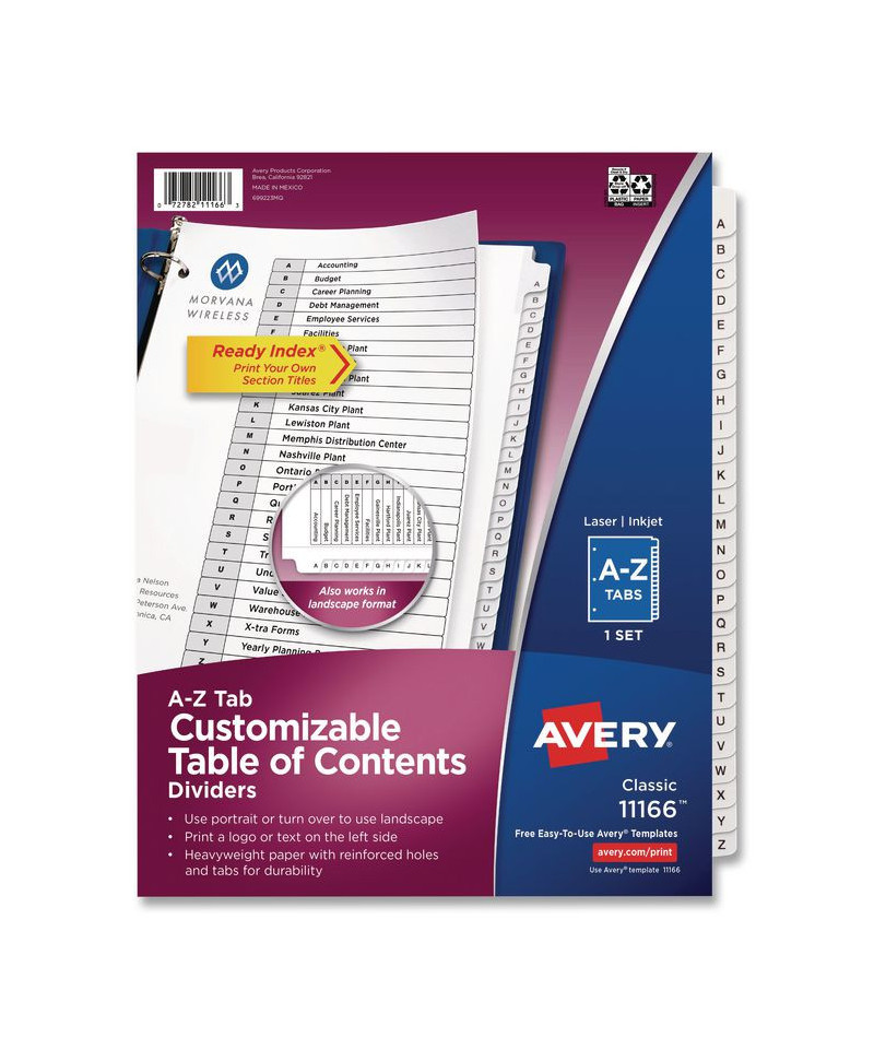 Sometimes finding information at a moment's notice seems like finding a needle in a haystack. These Ready Index® Table of Contents Dividers help you stay organized so you can locate important documents quickly and easily. They feature preprinted alphabetical or numerical tabs that are reinforced for durability and can be used in either landscape or portrait format. Using free templates from Avery Design & Print, you can customize the included title page and print in minutes. Organization and efficiency,— now that's sharp thinking.