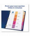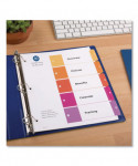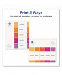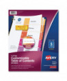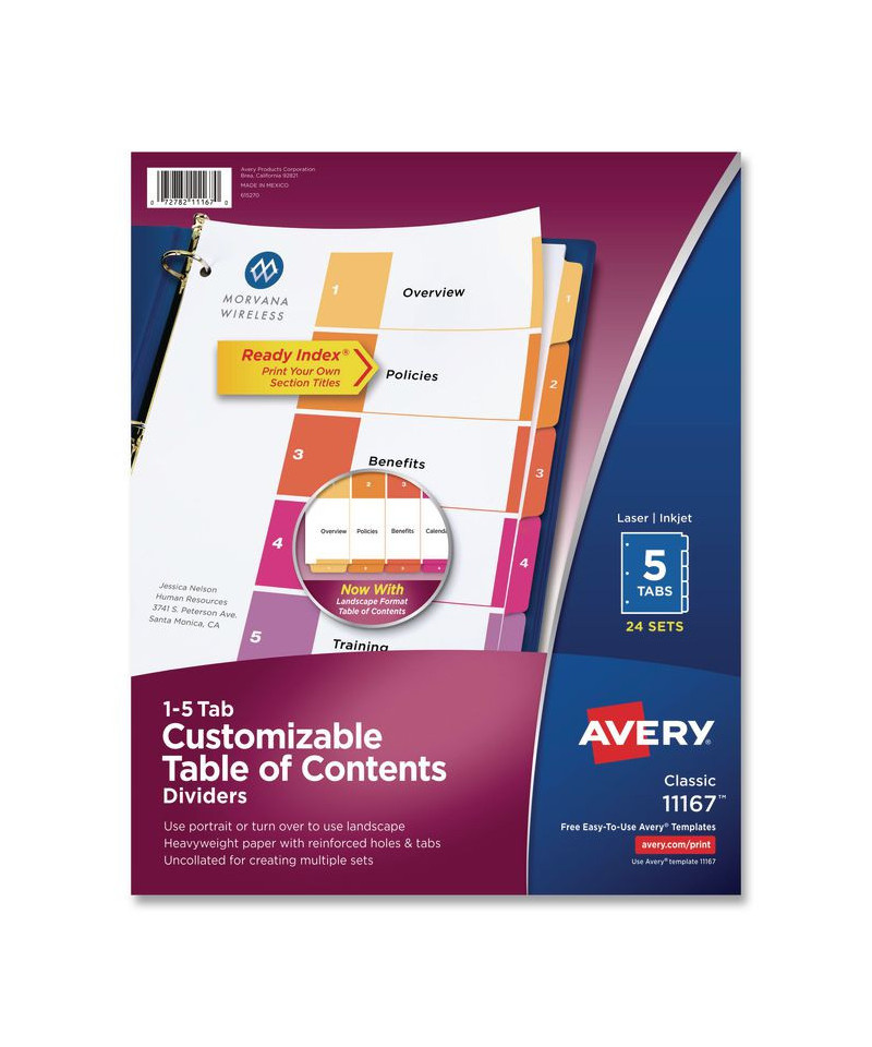 Organized documentation makes a business run like a well-oiled machine. These Ready Index Table of Contents Dividers help you stay organized so you can locate documents quickly and efficiently. They feature preprinted multicolor tabs that can be displayed in either landscape or portrait format. Using free templates from Avery Design & Print you can customize the included table of contents page and print in minutes. Organization and efficiency-makes life better for your business. For laser and inkjet printers.