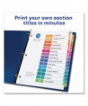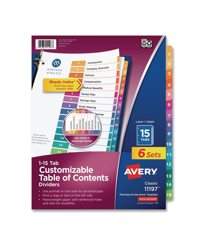 Organized documentation makes a business run like a well-oiled machine. These Ready Index Table of Contents Dividers help you stay organized so you can locate documents quickly and efficiently. They feature preprinted multicolor tabs that can be displayed in either landscape or portrait format. Using free templates from Avery Design & Print you can customize the included table of contents page and print in minutes. Organization and efficiency-makes life better for your business. For laser and inkjet printers.