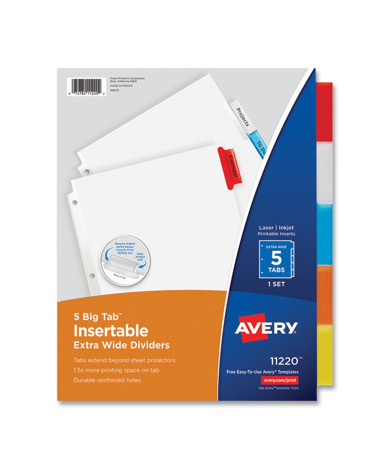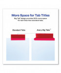 Big Tab dividers are bigger providing 50% more writing space than standard tabs. Special tab design allows easy insertion and removal, but keeps insert securely in place. Reinforced binding edge. White or buff paper dividers with clear or multicolor insertable tabs. It's easy to customize inserts using free templates from Avery Design & Print. Three-hole punched for use in standard ring binders, mini size 5.5 x 8.5 dividers are seven-hole punched for small binders and organizers, and legal size are 4-hole punched for legal size binders. Handwrite or print inserts on laser and inkjet printers.