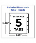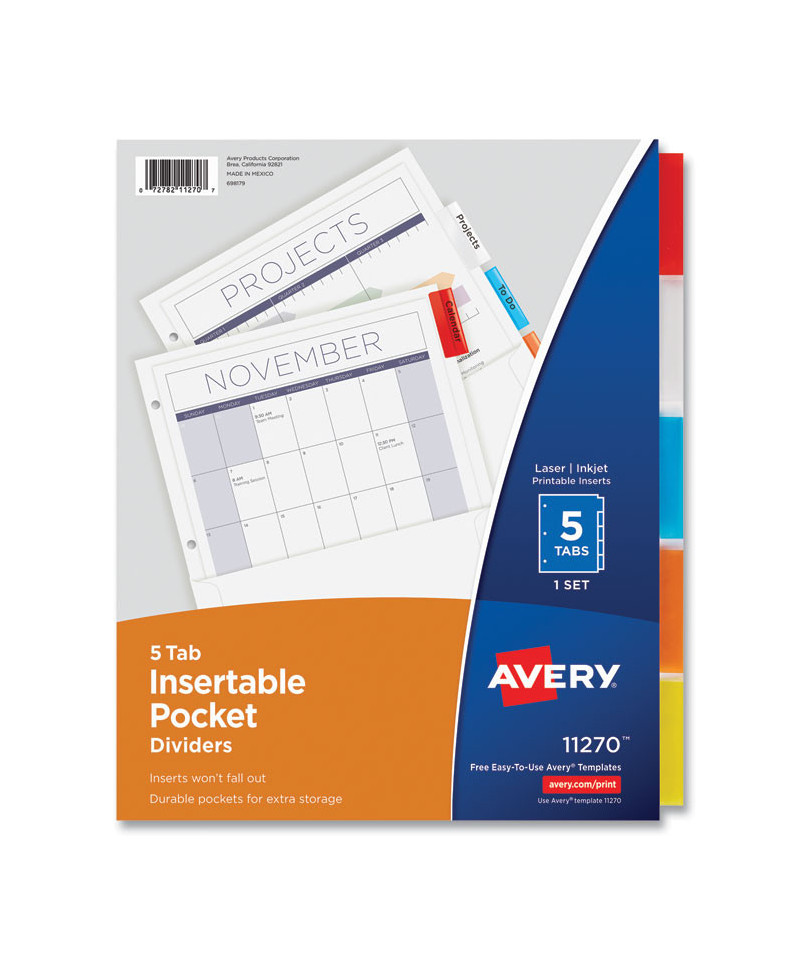 With these convenient pocket insertable dividers, you've got a new method for success. Each divider features a front storage pocket wide enough to hold 8.5 x 11 pages without punching or folding. Stash loose papers, CDs, notes and more. Insertable tabs assist in easy reference. Rip-Proof™ tabs maintain secure and stable placement. Using free templates from Avery Design & Print it's simple to customize the included tab inserts. These dividers keep your important papers efficiently separated and stored. Handwrite or print inserts on laser and inkjet printers.