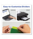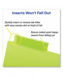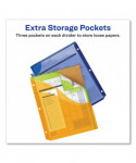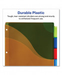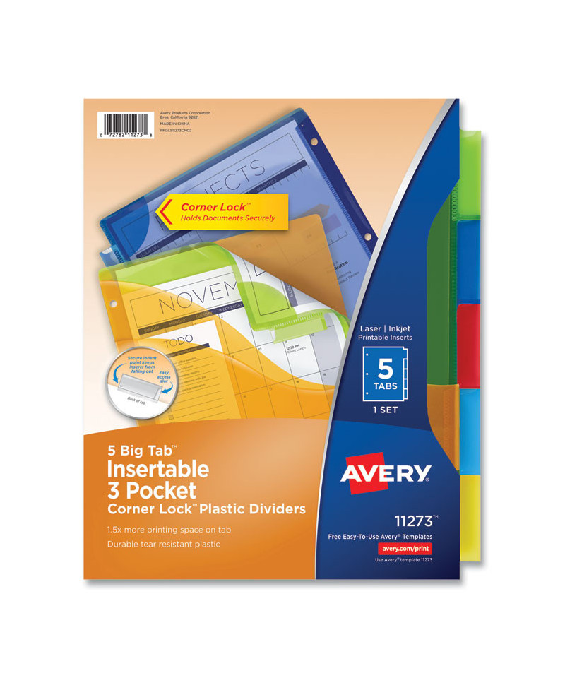 Keep papers safe and secure with these Insertable Plastic Dividers. They offer storage space along with extra large tabs in eye-catching colors for quick, easy reference. Each divider features three pockets constructed in durable plastic to accommodate loose papers up to 8 1/2" x 11" without folding or punching. The unique Corner Lock® tab helps keep your papers in place. Big Tab™ multicolored dividers have tabs that are bigger, providing 50% more writing space than standard tabs. Three-hole punched and ready-to-use. Now that's a big idea. Handwrite or print inserts on laser and inkjet printers.