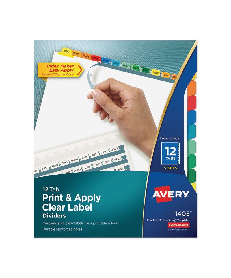 Organization is made easy with Index Maker® Dividers. Whether you're coordinating a single project or multiple binder sets, these dividers let you to get it done quickly and easily, with professional results. The clear labels virtually disappear on the tabs, giving your dividers a clean, printed-on look. Save time with the Easy Apply strip that lets you label all the tabs at once, making it simple to create custom dividers right from your desktop. Just use the free templates from Avery Design & Print and you can personalize and print your Easy Apply tab labels in minutes. With these dividers you get a professional, easy-to-use solution to keep all your projects organized. For laser and inkjet printers.