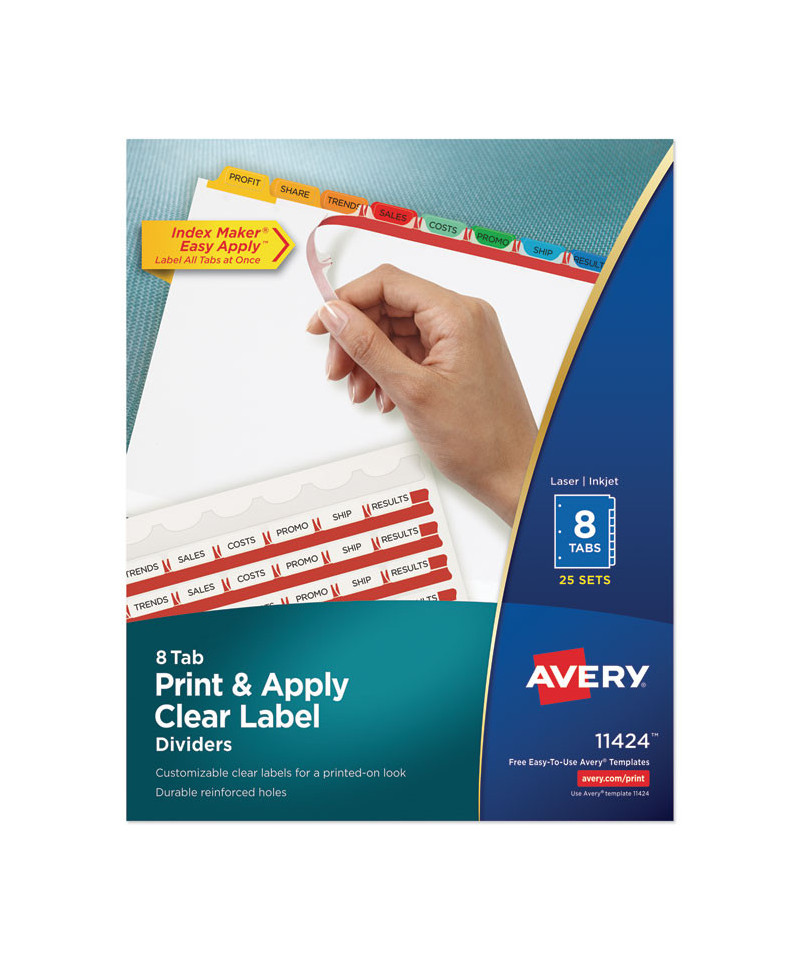 Organization is made easy with Index Maker® Dividers. Whether you're coordinating a single project or multiple binder sets, these dividers let you to get it done quickly and easily, with professional results. The clear labels virtually disappear on the tabs, giving your dividers a clean, printed-on look. Save time with the Easy Apply strip that lets you label all the tabs at once, making it simple to create custom dividers right from your desktop. Just use the free templates from Avery Design & Print and you can personalize and print your Easy Apply tab labels in minutes. With these dividers you get a professional, easy-to-use solution to keep all your projects organized. For laser and inkjet printers.