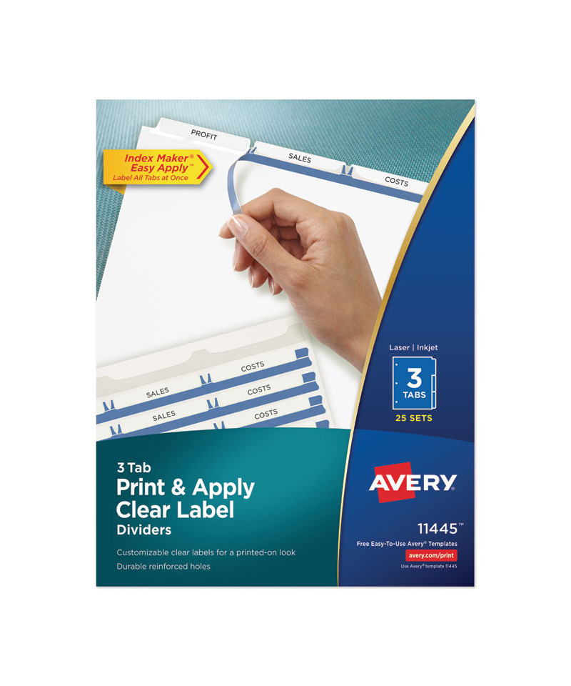 Whether you're organizing a single project or creating multiple sets, Index Maker® clear labels virtually disappear on divider tabs to give you a professional printed-on look. The Easy Apply label strip lets you label all tabs at once. Easy to customize with free templates from Avery Design & Print. Big Tab and Extra Wide selections offer greater convenience in office-wide references. Standard and mini size selections provide streamlined indexing in standard binders, planners and small personal binders. For laser and inkjet printers.