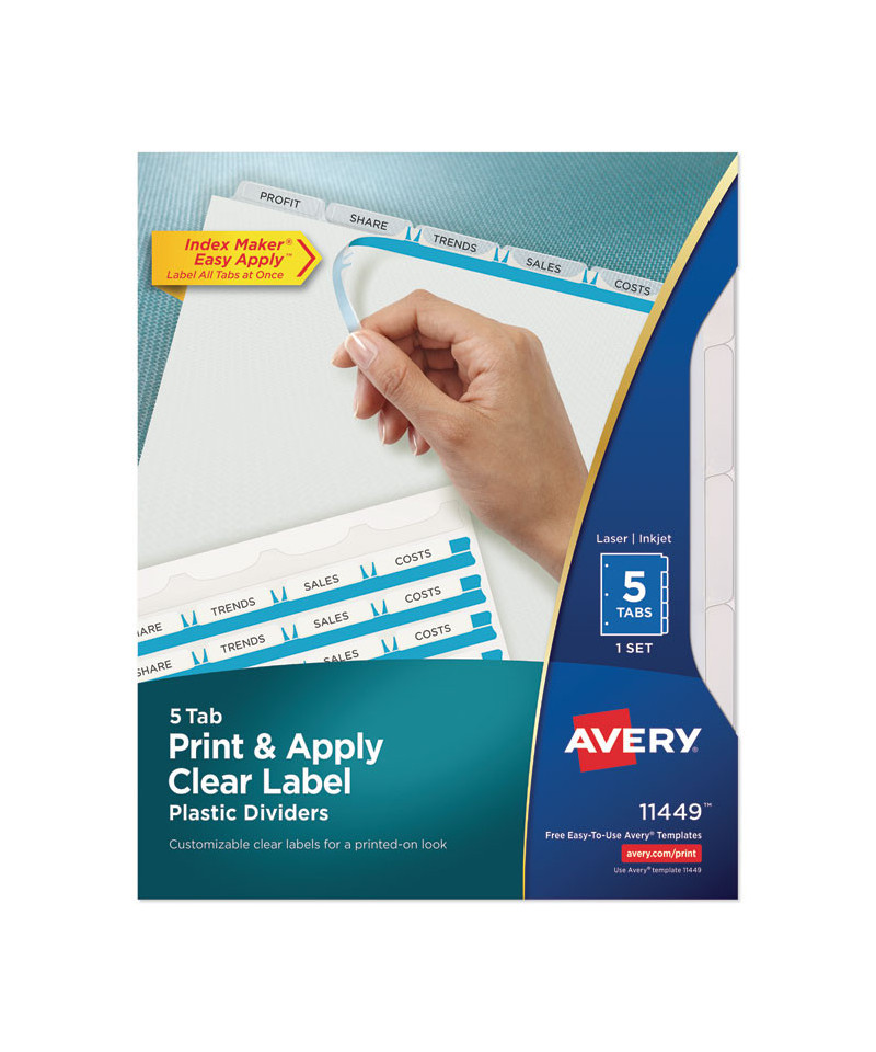 Organize with durable plastic dividers. Clear labels virtually disappear when applied to tabs. Label all tabs at once using the Easy Apply™ label strip. Creating tab labels is quick and easy using free templates from Avery Design & Print. For laser and inkjet printers.