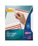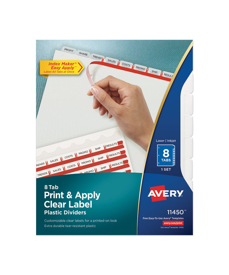 Whether you're organizing one project or creating multiple binders for a meeting or event, Index Maker® Dividers let you to get it done quickly and easily, with professional results. Durable clear or colored plastic dividers add impact while making it easier to flip between sections. The clear labels virtually disappear on the tabs, giving your dividers a clean, printed-on look. Save time with the Easy Apply™ strip that lets you label all the tabs at once, making it simple to create custom dividers right from your desktop. Just use the free templates from Avery Design & Print and you can personalize and print your Easy Apply™ tab labels in minutes. These versatile dividers are the easy-to-use solution for your organizational needs. For laser and inkjet printers.