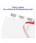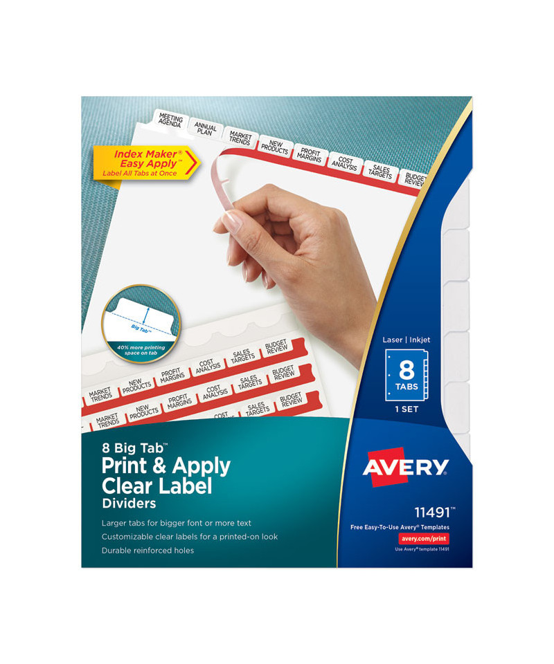 Whether you're organizing a single project or creating multiple sets, Index Maker® clear labels virtually disappear on divider tabs to give you a professional printed-on look. The Easy Apply label strip lets you label all tabs at once. Easy to customize with free templates from Avery Design & Print. Big Tab and Extra Wide selections offer greater convenience in office-wide references. Standard and mini size selections provide streamlined indexing in standard binders, planners and small personal binders. For laser and inkjet printers.