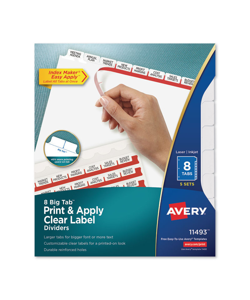 Whether you're organizing a single project or creating multiple sets, Index Maker® clear labels virtually disappear on divider tabs to give you a professional printed-on look. The Easy Apply label strip lets you label all tabs at once. Easy to customize with free templates from Avery Design & Print. Big Tab and Extra Wide selections offer greater convenience in office-wide references. Standard and mini size selections provide streamlined indexing in standard binders, planners and small personal binders. For laser and inkjet printers.