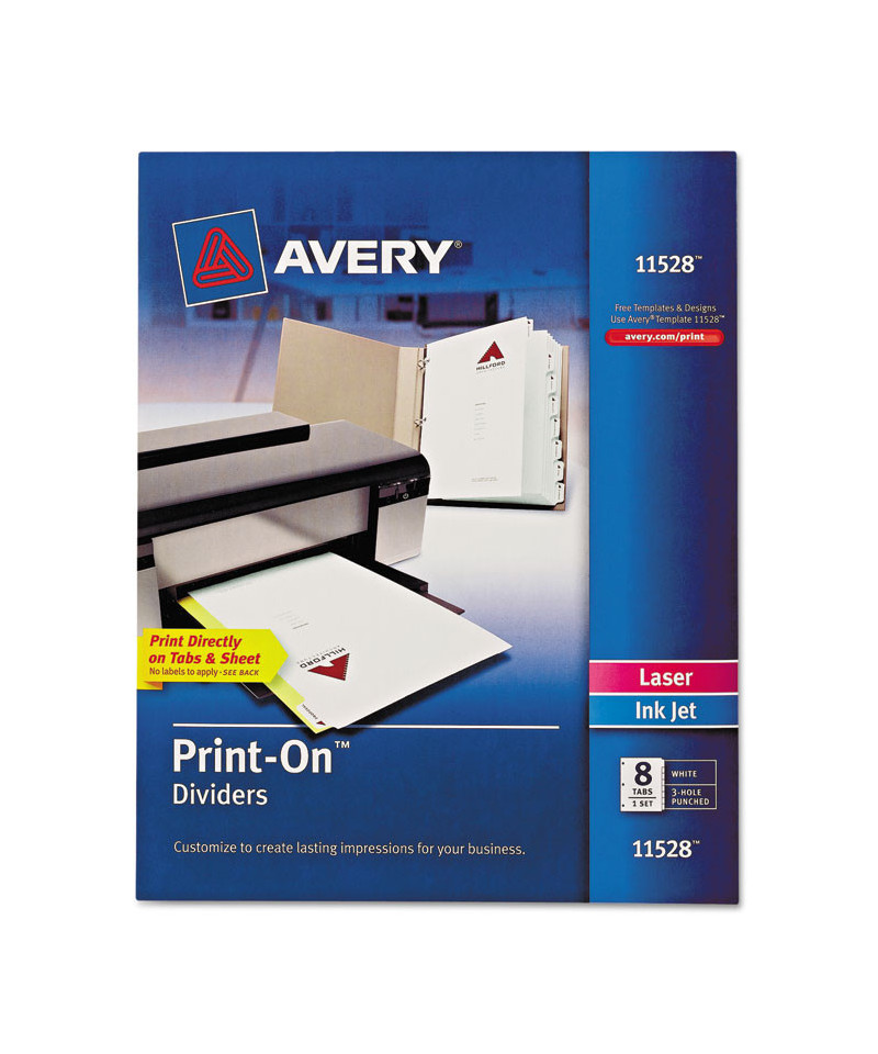 Print professional-looking dividers for presentations from your computer. Print logo, text and graphics directly on tabs and divider sheet. Print in either landscape or portrait format. Easy to customize with free templates from Avery® Design & Print. For laser, color laser and inkjet printers.