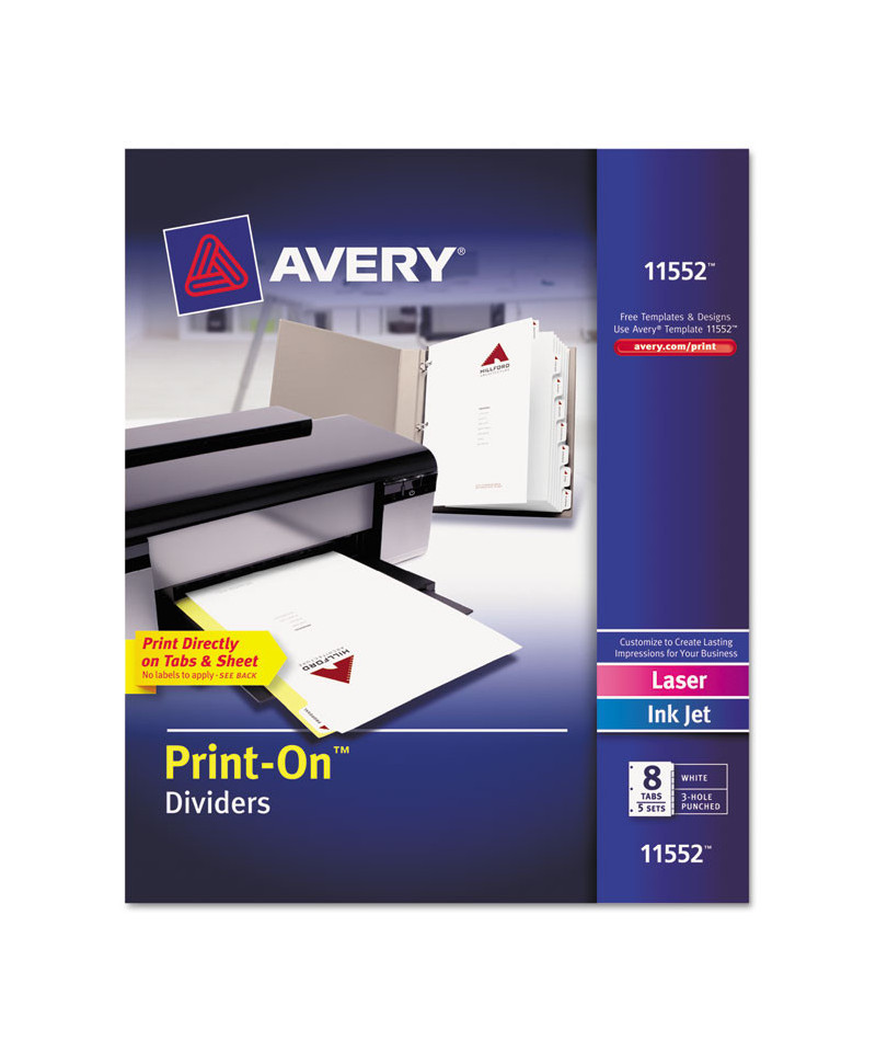 Print professional-looking dividers for presentations from your computer. Print logo, text and graphics directly on tabs and divider sheet. Print in either landscape or portrait format. Easy to customize with free templates from Avery® Design & Print. For laser, color laser and inkjet printers.