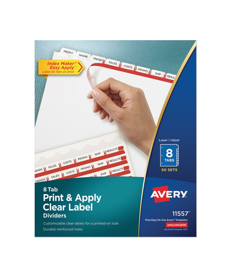 Whether you're organizing a single project or creating multiple sets, Index Maker® clear labels virtually disappear on divider tabs to give you a professional printed-on look. The Easy Apply label strip lets you label all tabs at once. Easy to customize with free templates from Avery Design & Print. Big Tab and Extra Wide selections offer greater convenience in office-wide references. Standard and mini size selections provide streamlined indexing in standard binders, planners and small personal binders. For laser and inkjet printers.