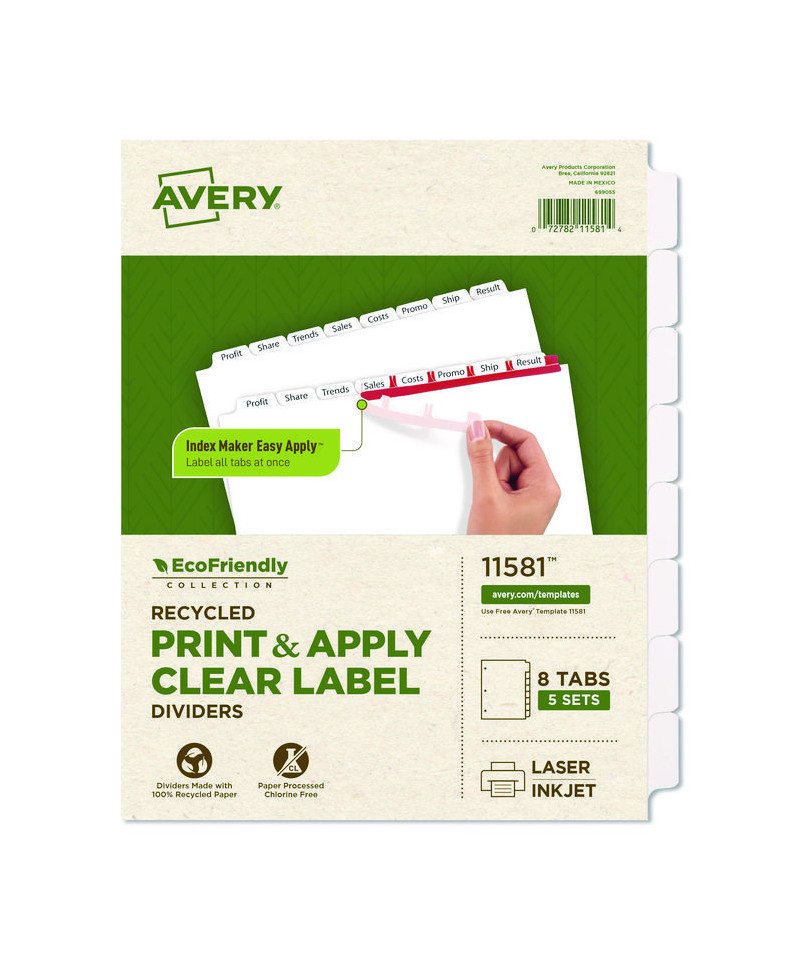 Dividers are made of post-consumer recycled materials and are processed chlorine-free. Clear labels virtually disappear when applied to tabs. Label all tabs at once using the Index Maker® Easy Apply label strip. Easy to customize with free templates from Avery Design & Print. For laser and inkjet printers.