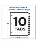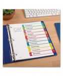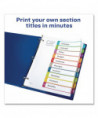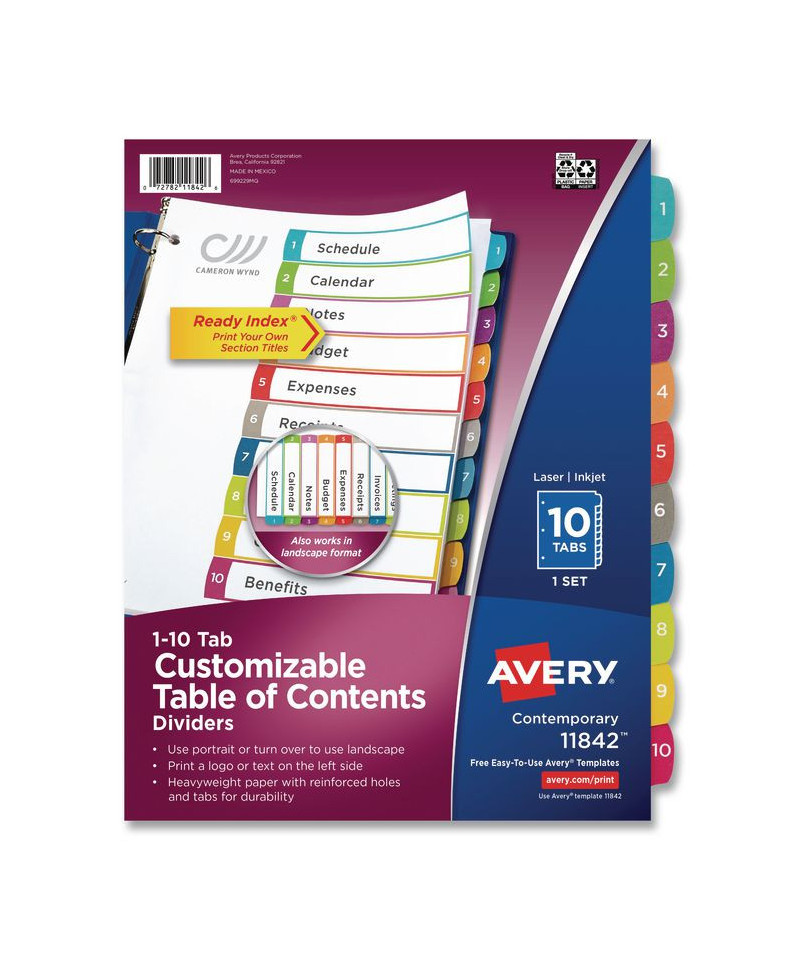 Organized documentation makes a business run like a well-oiled machine. These Ready Index Table of Contents Dividers help you stay organized so you can locate documents quickly and efficiently. They feature preprinted multicolor tabs that can be displayed in either landscape or portrait format. Using free templates from Avery Design & Print you can customize the included table of contents page and print in minutes. Organization and efficiency-makes life better for your business. For laser and inkjet printers.