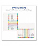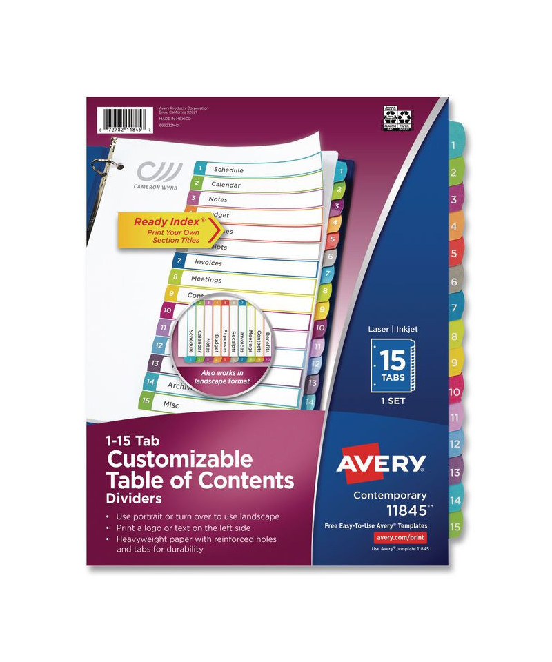Organized documentation makes a business run like a well-oiled machine. These Ready Index Table of Contents Dividers help you stay organized so you can locate documents quickly and efficiently. They feature preprinted multicolor tabs that can be displayed in either landscape or portrait format. Using free templates from Avery Design & Print you can customize the included table of contents page and print in minutes. Organization and efficiency-makes life better for your business. For laser and inkjet printers.