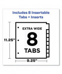 Strong organization and storage capabilities are yours with the help of these Big Tab Two-Pocket Insertable Plastic Dividers. Each divider features double plastic pockets, one on each side of the divider, to provide extra storage space for your important papers. The Big Tab design allows you to use larger fonts or more lines of text than on typical inserts for easier reading or more detailed labeling. Use a free template from Avery Design & Print to customize tabs titles onto the included label sheets using your computer and printer. The tabs' unique design keeps inserts from falling out, so your dividers stay securely labeled. Constructed with durable plastic, these dividers offer lasting organization in a big way. Handwrite or print inserts on laser and inkjet printers.