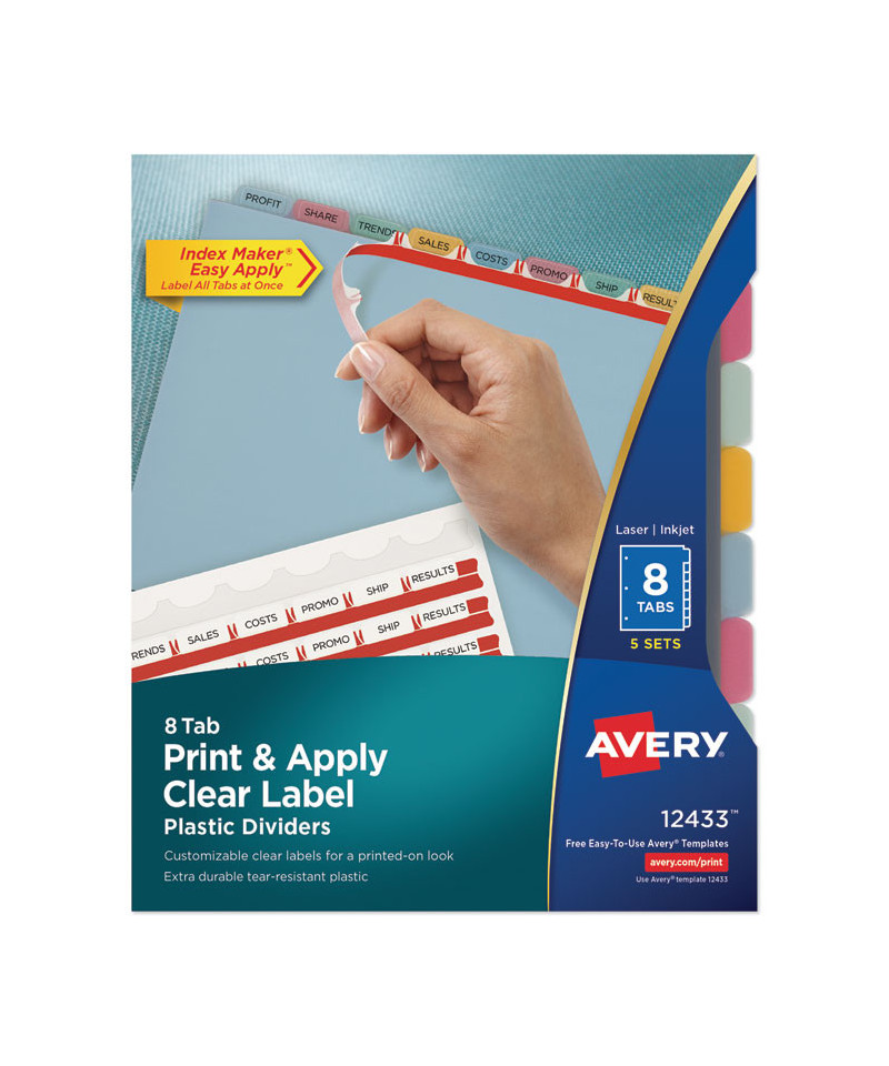 Whether you're organizing one project or creating multiple binders for a meeting or event, Index Maker® Dividers let you to get it done quickly and easily, with professional results. Durable clear or colored plastic dividers add impact while making it easier to flip between sections. The clear labels virtually disappear on the tabs, giving your dividers a clean, printed-on look. Save time with the Easy Apply™ strip that lets you label all the tabs at once, making it simple to create custom dividers right from your desktop. Just use the free templates from Avery Design & Print and you can personalize and print your Easy Apply™ tab labels in minutes. These versatile dividers are the easy-to-use solution for your organizational needs. For laser and inkjet printers.