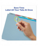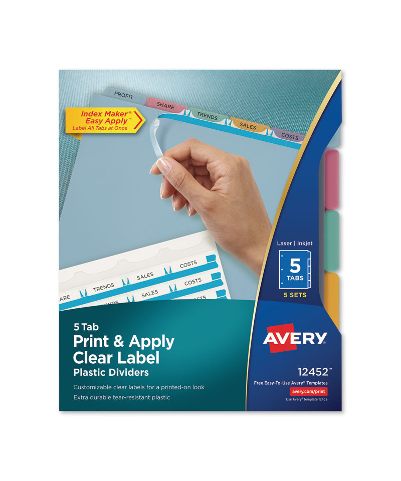 Whether you're organizing one project or creating multiple binders for a meeting or event, Index Maker® Dividers let you to get it done quickly and easily, with professional results. Durable clear or colored plastic dividers add impact while making it easier to flip between sections. The clear labels virtually disappear on the tabs, giving your dividers a clean, printed-on look. Save time with the Easy Apply™ strip that lets you label all the tabs at once, making it simple to create custom dividers right from your desktop. Just use the free templates from Avery Design & Print and you can personalize and print your Easy Apply™ tab labels in minutes. These versatile dividers are the easy-to-use solution for your organizational needs. For laser and inkjet printers.