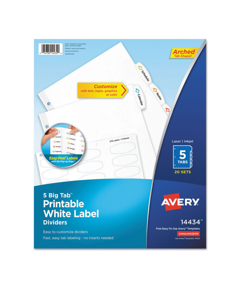 Arched shaped tabs and labels give a contemporary look. Easy Peel® labels with Pop-up Edge® for fast, easy tab labeling- no inserts needed. Print in black & white or create a custom color set with print-to-the-edge labels. Easy to customize with free templates and designs using Avery Design & Print. Label the front and back of the tabs for quick referencing. For laser and inkjet printers.