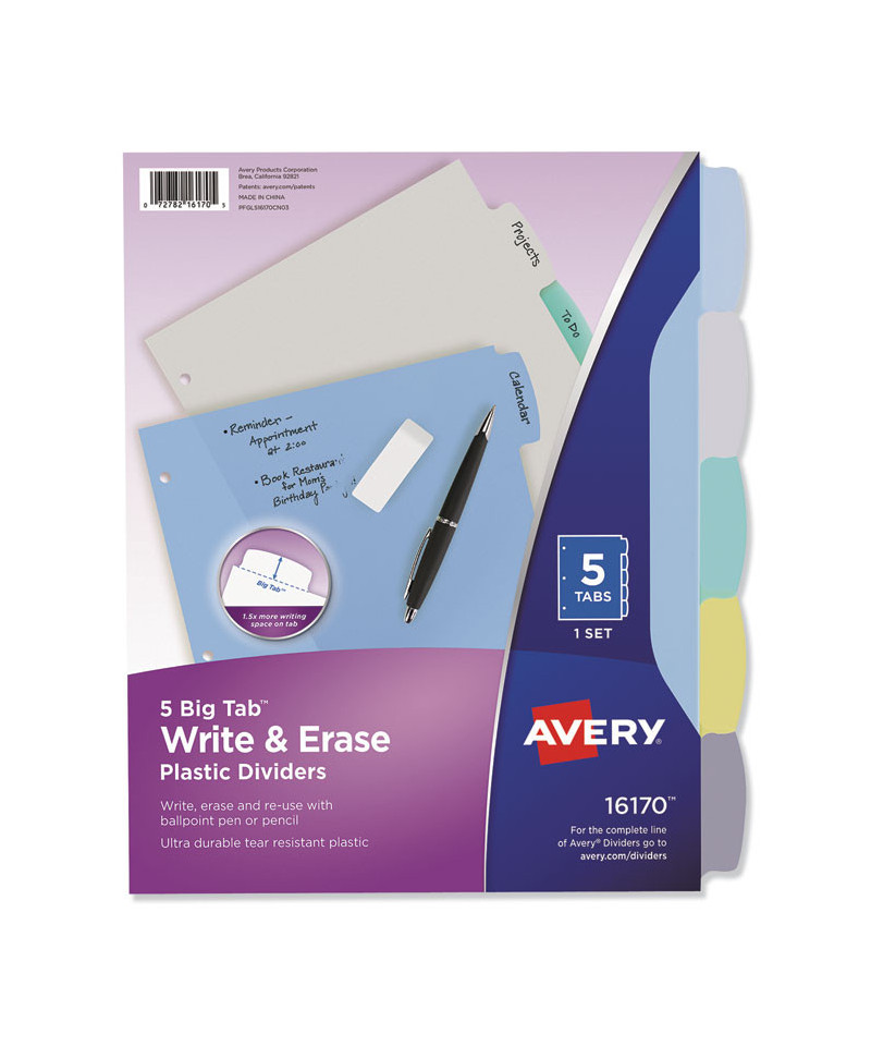 Get your binder organization on the right track with these Durable Plastic Write-On Dividers. The stylish tab design offers plenty of room for you to label each divider for reference at a glance. Stylishly shaped Big Tab™ Dividers are larger, providing 50% more writing space than standard tabs. Using your ballpoint pen or pencil, you can customize your dividers easily. To reuse, simply erase your previous label and write in the new one. Use the Corner Lock™ With Expandable Pocket or slash pockets for storage. Plastic dividers also available in large 11" x 17" and mini size. You'll be on the road to better organization with these dividers.