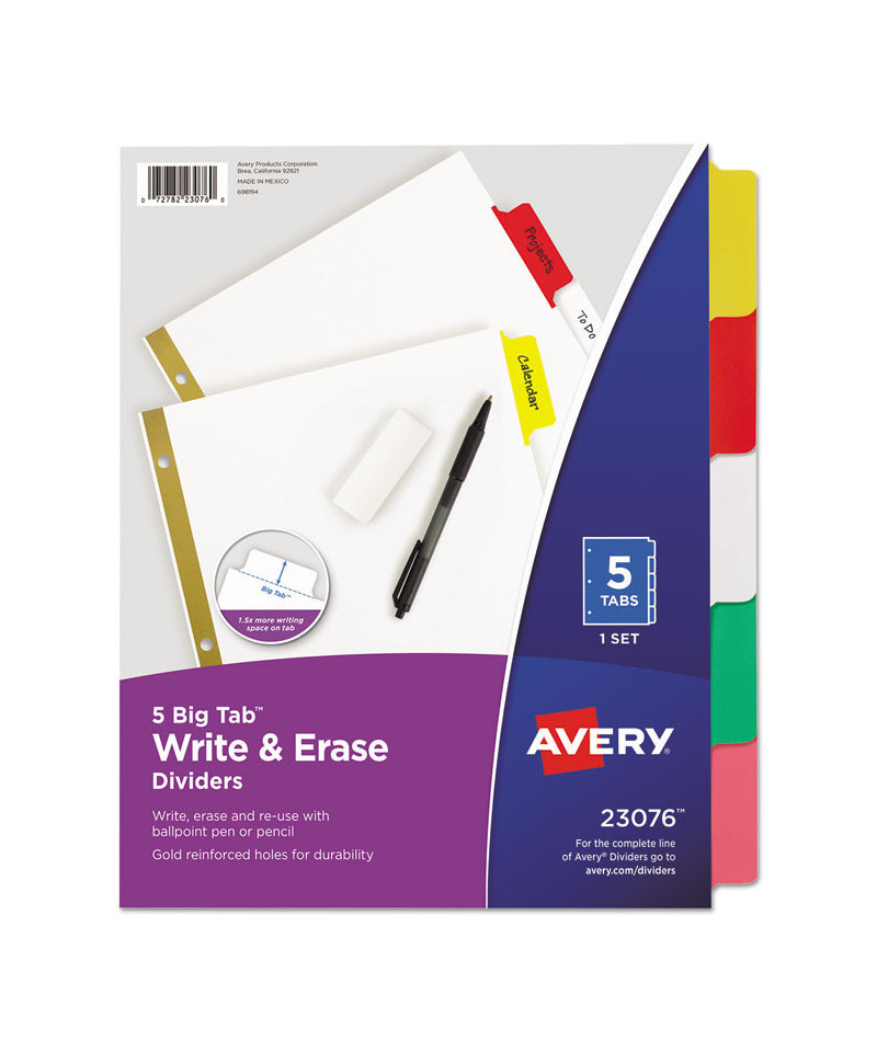 These Big Tab Write-On Dividers offer the best of both worlds. They feature tabs that are 50% larger than standard tabs, offering more room for larger fonts or extra text, plus the tabs' laminated surface lets you write, erase and reuse with ease. Use a ballpoint pen or pencil to label the tabs whenever a change is needed. Gold line reinforced binding edge for tear resistance at binder holes. It's organization made easy.