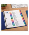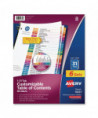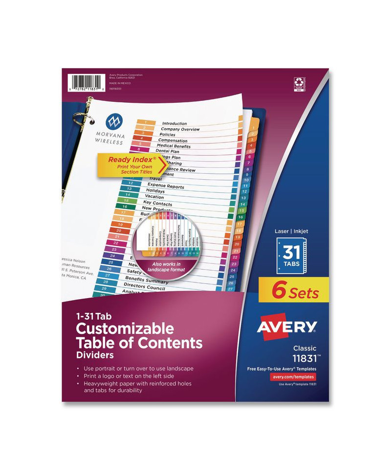 Organized documentation makes a business run like a well-oiled machine. These Ready Index Table of Contents Dividers help you stay organized so you can locate documents quickly and efficiently. They feature preprinted multicolor tabs that can be displayed in either landscape or portrait format. Using free templates from Avery Design & Print you can customize the included table of contents page and print in minutes. Organization and efficiency-makes life better for your business. For laser and inkjet printers.