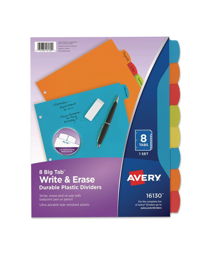 Write & Erase durable plastic dividers let you write, erase and reuse your dividers for easy changes at any time. Simply write directly on the tabs with a ballpoint pen or pencil, and erase as needed. You can also take quick notes on the divider body and easily erase later. Made from ultra-durable, tear-resistant plastic, these dividers are ideal for frequent use in any three-ring binder. The Big Tab™ design offers 1.5 times more writing space than standard divider tabs, and the multiple colors allow for quick referencing. Ideal for your personal organization at home, work and school.