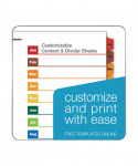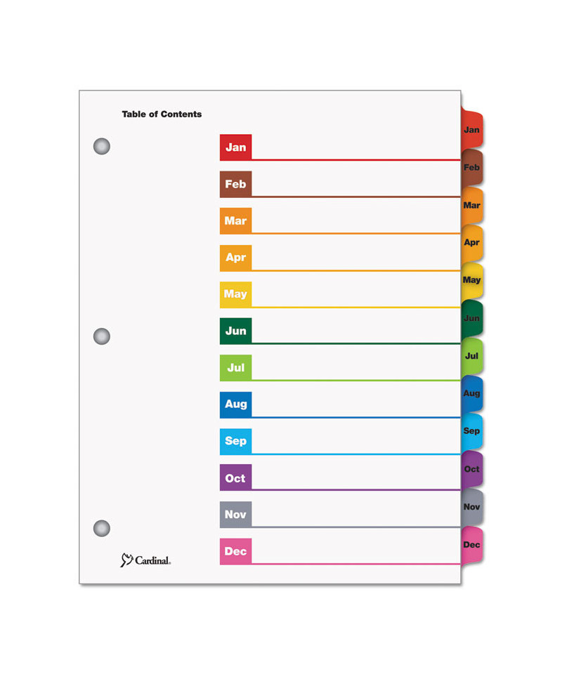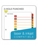 Cardinal® OneStep® Table of Contents Dividers help you create an index system instantly. Matching, preprinted tabs on the divider sheets can be used in either vertical or landscape formats. Tab sets have coordinating Table of Content sheets. Easy to use, free templates in your favorite software are available online; details on packaging. Tabs and ring edges are reinforced to withstand heavy use. Laser and inkjet compatible. Three-hole punched and sized for 8.5" x 11" sheets.