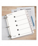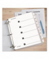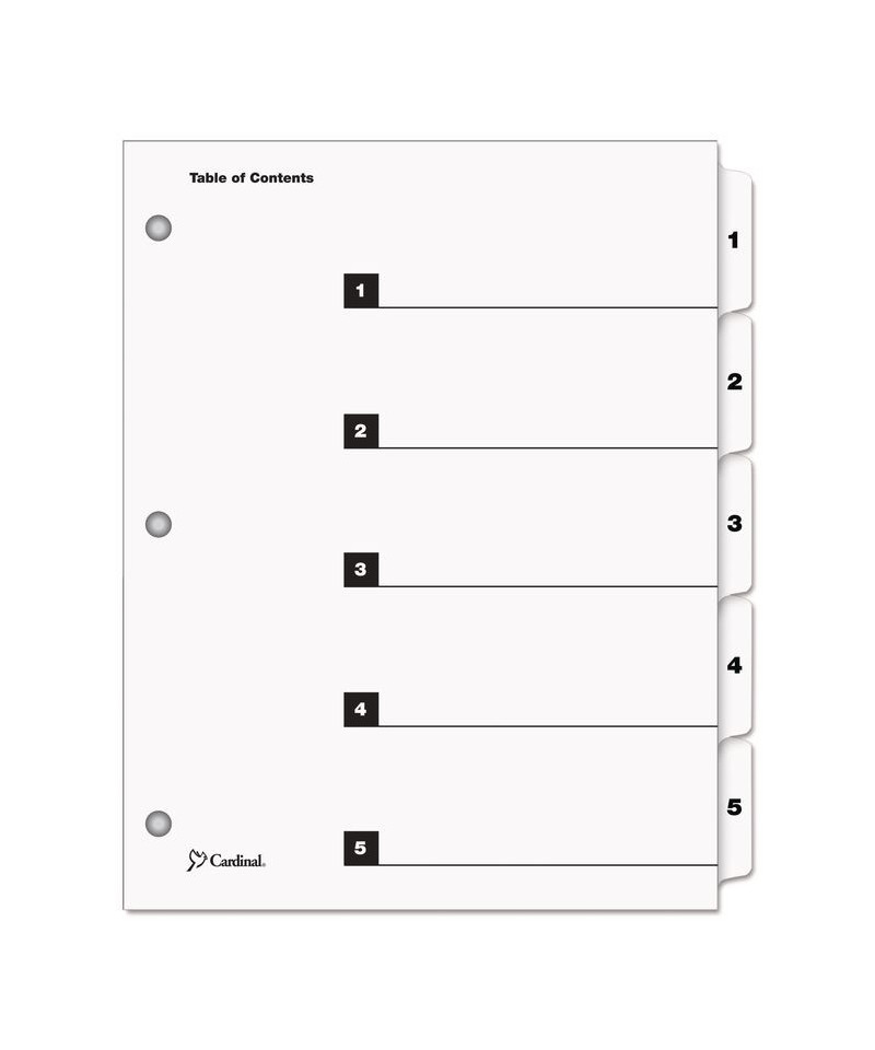 Cardinal® OneStep® Table of Contents Dividers help you create an index system instantly. Matching, preprinted tabs on the divider sheets can be used in either vertical or landscape formats. Tab sets have coordinating Table of Content sheets. Easy to use, free templates in your favorite software are available online; details on packaging. Tabs and ring edges are reinforced to withstand heavy use. Laser and inkjet compatible. Three-hole punched and sized for 8.5" x 11" sheets.