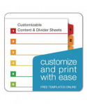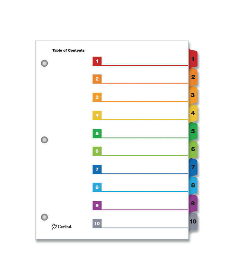 Cardinal® OneStep® Table of Contents Dividers help you create an index system instantly. Matching, preprinted tabs on the divider sheets can be used in either vertical or landscape formats. Tab sets have coordinating Table of Content sheets. Easy to use, free templates in your favorite software are available online; details on packaging. Tabs and ring edges are reinforced to withstand heavy use. Laser and inkjet compatible. Three-hole punched and sized for 8.5" x 11" sheets.