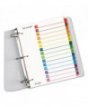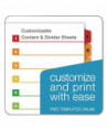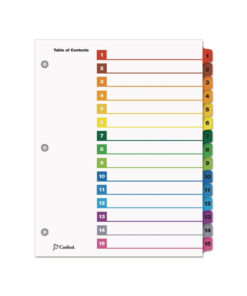 Cardinal® OneStep® Table of Contents Dividers help you create an index system instantly. Matching, preprinted tabs on the divider sheets can be used in either vertical or landscape formats. Tab sets have coordinating Table of Content sheets. Easy to use, free templates in your favorite software are available online; details on packaging. Tabs and ring edges are reinforced to withstand heavy use. Laser and inkjet compatible. Three-hole punched and sized for 8.5" x 11" sheets.