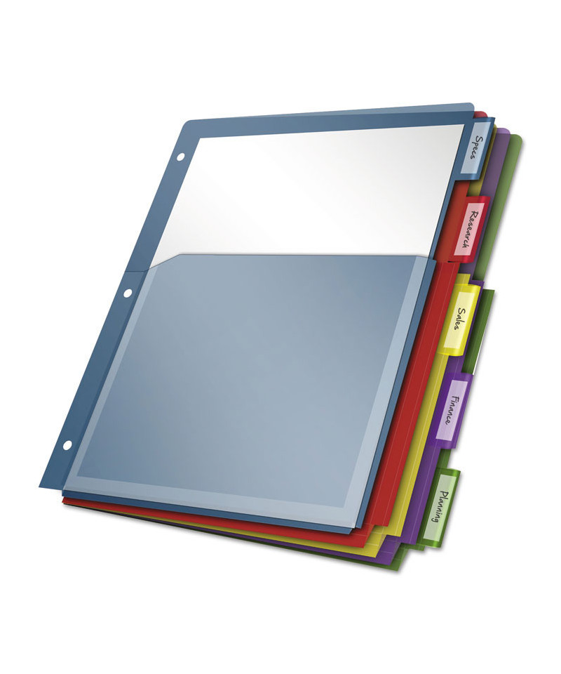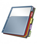 Up to 100 sheets fit into each of these extra-tough poly pockets. Large tabs are designed to provide ample room for titles, and paper inserts won't fall out. Paper tab inserts included. Scratch-resistant, non-transfer material is safe for all documents and photos. Dividers are three-hole punched to fit 3-ring binders.