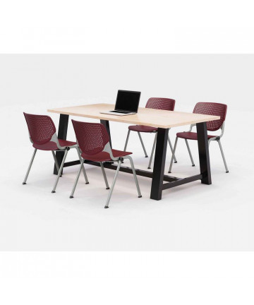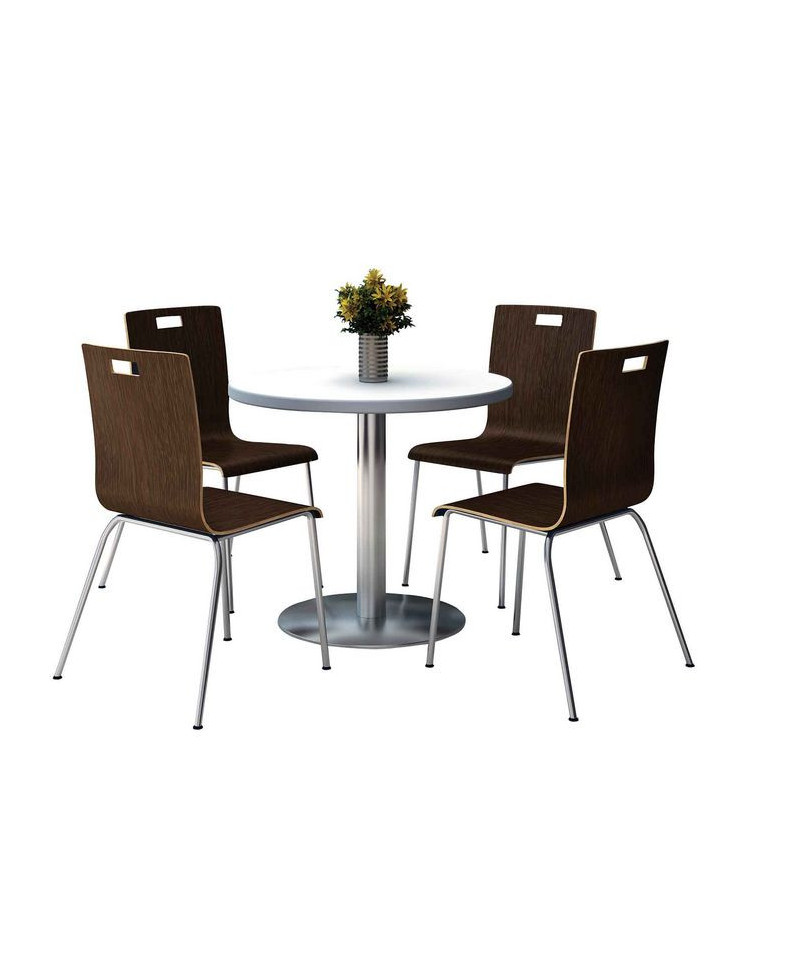 Attractive and contemporary breakroom/cafeteria furniture. Table and 4 chair set. The table is 1.25" thick with a high-pressure laminate surface and T-mold edge. The base is made of durable cast iron. The column is 16-gauge steel with a 3" diameter. Leveling glides for stability on uneven floors. The chair is made of attractive bent plywood and has a durable high pressure laminate surface. 0.75" inch round chromed 16-gauge steel tube frame. Non-marring polyurethane glides. Chairs stack 5 high. Overall chair dimensions: 20.5" W x 21" D x 34" H. Tables shipped unassembled. Chairs shipped assembled.