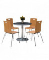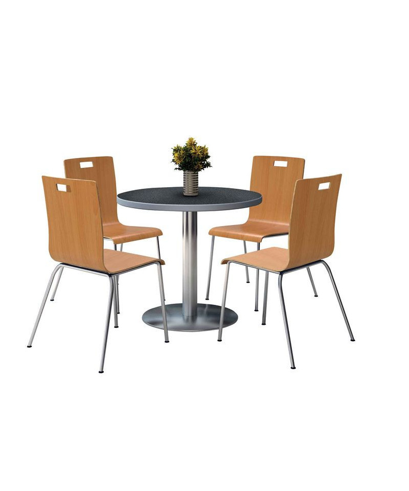 Attractive and contemporary breakroom/cafeteria furniture. Table and 4 chair set. The table is 1.25" thick with a high-pressure laminate surface and T-mold edge. The base is made of durable cast iron. The column is 16-gauge steel with a 3" diameter. Leveling glides for stability on uneven floors. The chair is made of attractive bent plywood and has a durable high pressure laminate surface. 0.75" inch round chromed 16-gauge steel tube frame. Non-marring polyurethane glides. Chairs stack 5 high. Overall chair dimensions: 20.5" W x 21" D x 34" H. Tables shipped unassembled. Chairs shipped assembled.