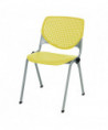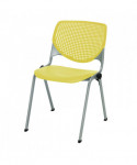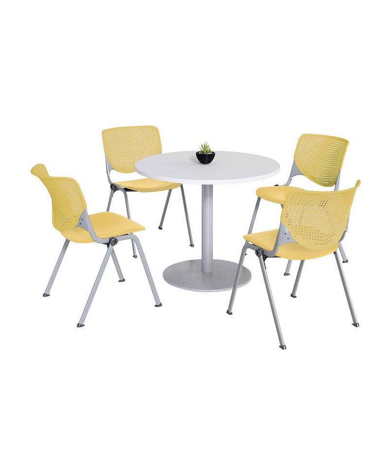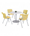 Contemporary and comfortable breakroom/cafeteria furniture. Table and 4 chair set. Table has a 1.25" thick high-pressure laminate top that's durable and easy to clean. The top has an attractive edge that won't crack or peel. The solid cast iron round base has leveling glides to prevent the table from wobbling on uneven floors. The base is made of durable cast iron with a 3" diameter column and is made of 16-gauge steel. The top and base are all shipped in one box. Easy to assemble. The chair has an "easy to clean" polypropylene seat and back. The ergonomic perforated back allows for enhanced circulation, while the radius conforms to your back for maximum comfort. The chair offers a contoured extra wide seat pan and a 400 lb. weight capacity to provide comfort and accommodate all sizes. The oval frame is made of 15-gauge steel with silver powder-coat. The 2300 is one of most complete stack chairs on the market. It's just plain.... KOOL. Tables shipped unassembled. Chairs shipped assembled.